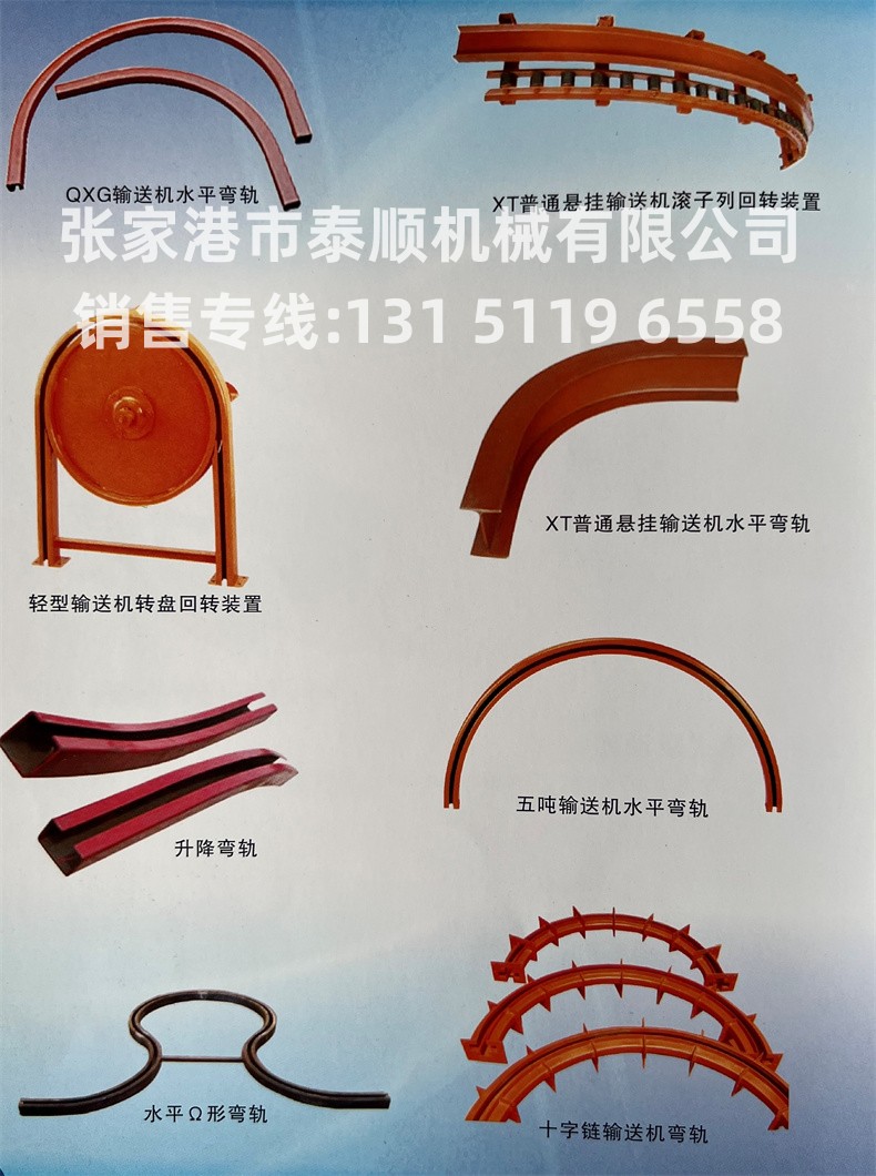 用于鏈條運(yùn)行轉(zhuǎn)彎處,最小轉(zhuǎn)彎半徑0.6M,可根據(jù)實(shí)際需要訂制。水平彎軌回轉(zhuǎn)半徑45度、90度、180度。用于懸掛鏈水平轉(zhuǎn)彎,可訂做。