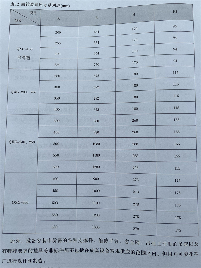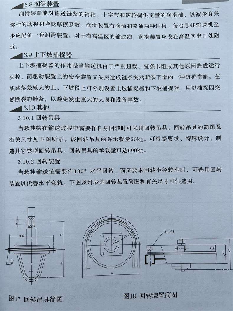 當(dāng)懸掛輸送鏈需要180°水平回轉(zhuǎn),而又要求回轉(zhuǎn)半徑較小時,可以選用回轉(zhuǎn)裝置代替水平彎軌
